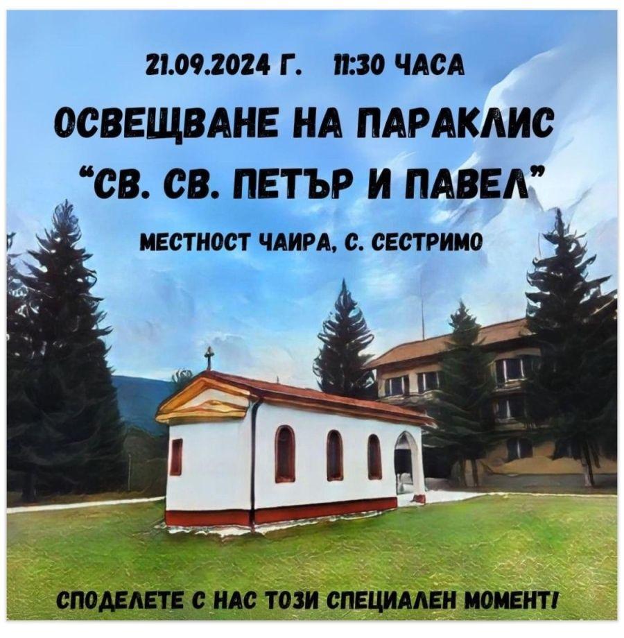 В 11:30 часа ще се състои освещаването на новопостроения параклис „Св. Св. Петър и Павел“ в местността Чаира край Сестримо. Този духовен обект е създаден с усилията на местната общност и представлява важен символ за селото, което пази своите православни традиции. Параклисът ще служи като място за молитва и размисъл, както и за събиране на хората от района около общите ценности и вяра.