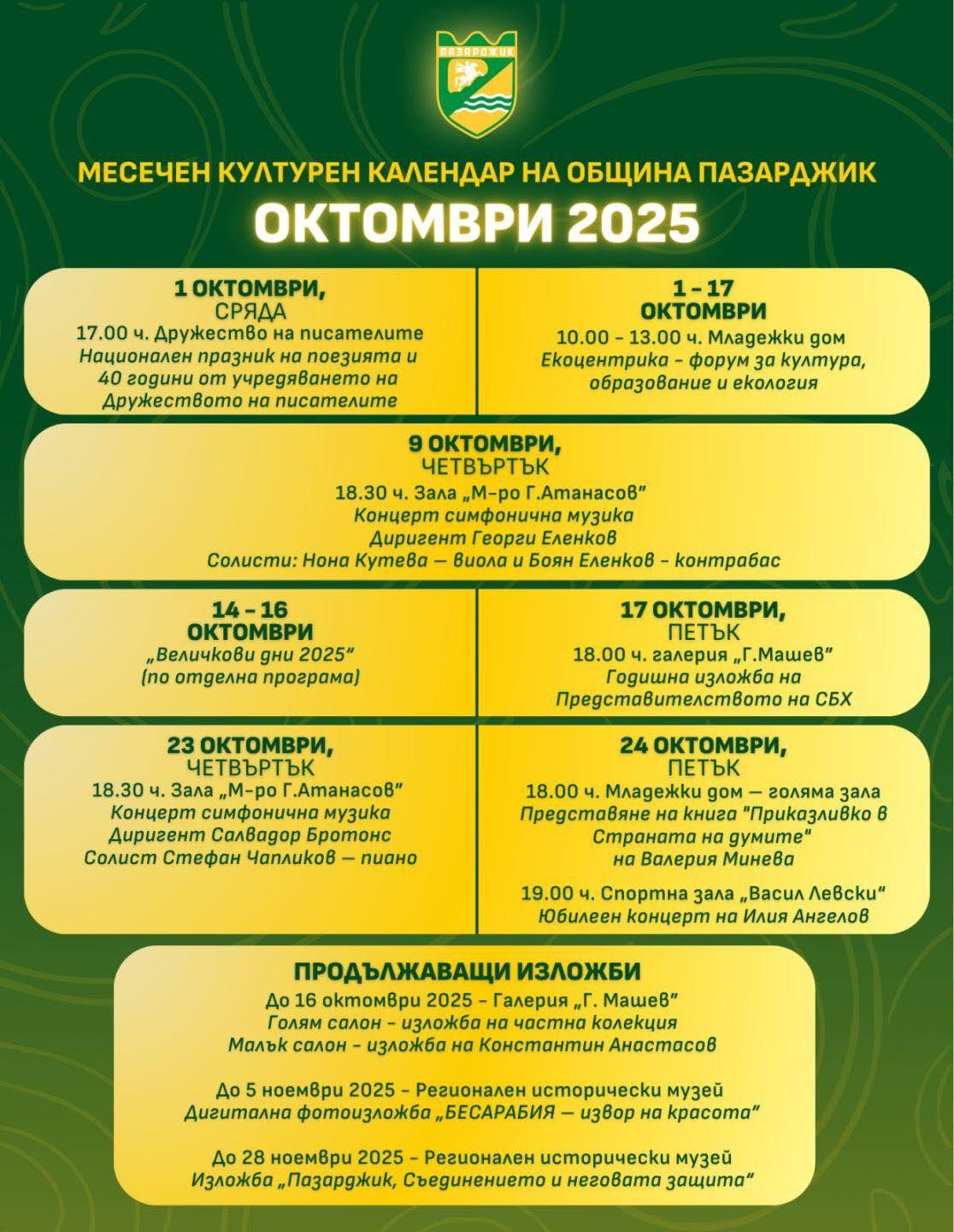 Октомври обещава да бъде месец, в който културата ще бъде близо до всеки – независимо дали обича класическата музика, театъра или съвременното изкуство. Пазарджик ви очаква, за да споделите магията на златната есен и нейните културни съкровища.