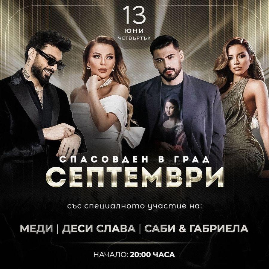 На 13 юни 2023 г. (четвъртък) на стадион „Локомотив“ в гр. Септември ще се проведе празнично събитие, което обещава да осигури незабравими емоции и весело настроение за всички присъстващи. За доброто настроение на жители и гости на общината ще се погрижат популярните изпълнители Меди, Деси Слава, Саби и Габриела.