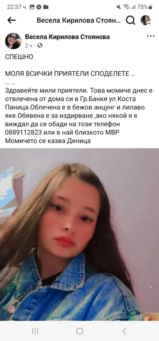 Късно вечерта в сряда социалните мрежи бяха залети от съобщение за предполагаемо отвличане на момиче на име Деница в гр. Банкя. Публикацията, направена от Весела Стоянова във Facebook, апелираше към гражданите за съдействие, призовавайки всеки, който има информация, да се свърже с МВР или с посочен телефонен номер.