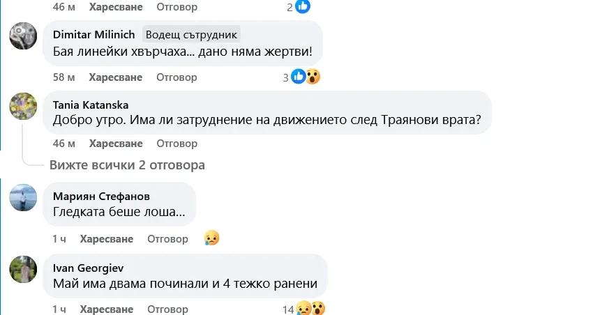 Очевидци съобщават за ужасяваща гледка – на мястото има няколко линейки, а пострадалите са в тежко състояние. По непотвърдена информация двама души са загинали, а броят на ранените е най-малко четирима.