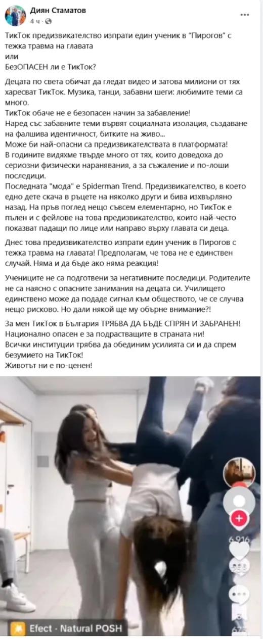 „ТикТок в България ТРЯБВА ДА БЪДЕ СПРЯН И ЗАБРАНЕН!“ – категоричен е Стаматов. Той подчертава, че учениците често не осъзнават опасностите, а родителите не са информирани за действията на децата си в интернет. Според него, институциите трябва да обединят усилията си, за да защитят живота и здравето на подрастващите.