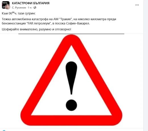 Рано тази сутрин тежка катастрофа между три автомобила блокира движението на АМ "Тракия" в посока Пловдив, около 13-ти километър. По информация на очевидци, магистралата временно е затворена, а движението се пренасочва през Нови хан.